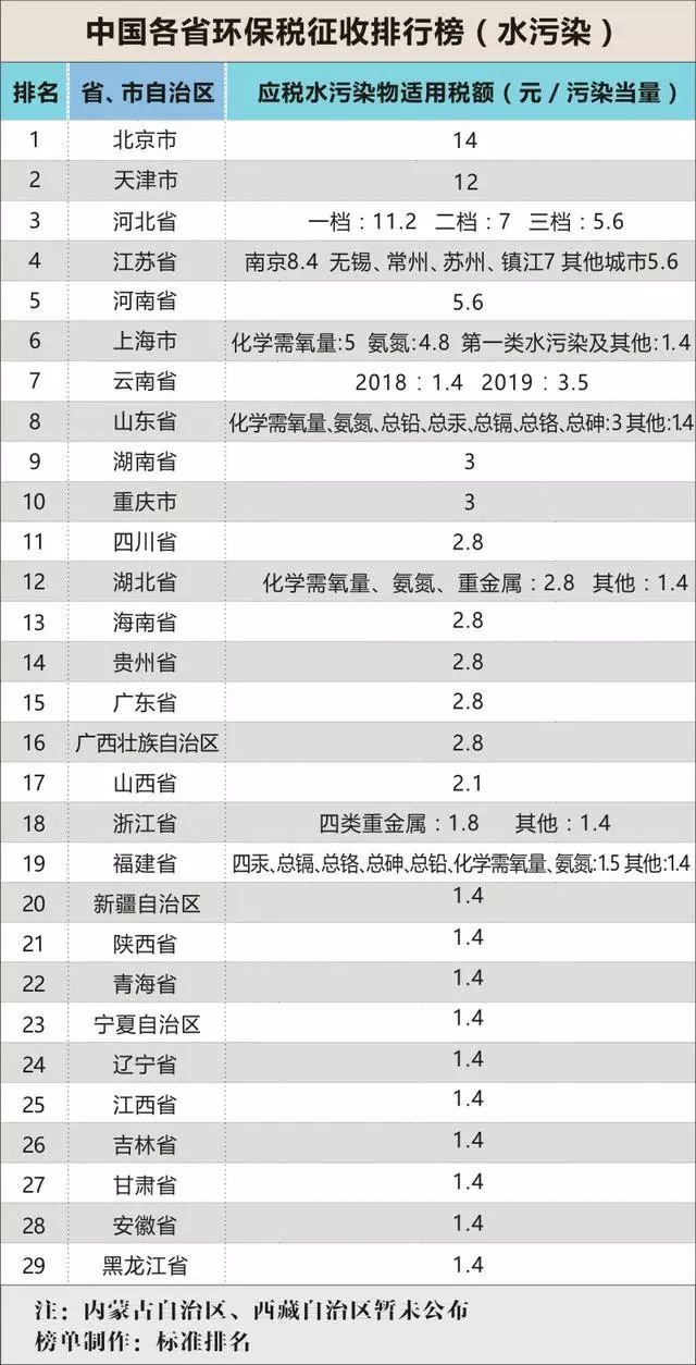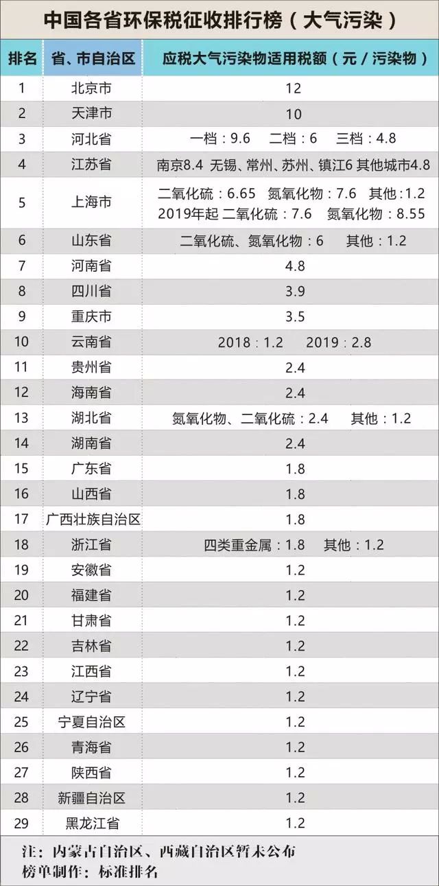標(biāo)準(zhǔn)排名發(fā)現(xiàn),北京市按最低稅額標(biāo)準(zhǔn)10倍的最高上限確定稅額,其大氣、水污染物稅額分別為每污染當(dāng)量12元和14元;天津大氣、水污染物稅額均比北京低2元,河北則按照最低稅額標(biāo)準(zhǔn)8倍確定了環(huán)北京13個(gè)縣的大氣和水中主要污染物的適用稅額。