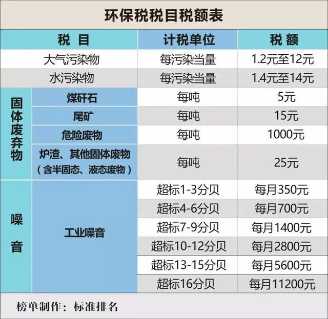 根據(jù)環(huán)保稅法,環(huán)保稅的征稅對(duì)象和范圍與現(xiàn)行排污費(fèi)基本相同,征稅范圍為直接向環(huán)境排放的大氣、水、固體和噪聲等污染物。其中,大氣污染物稅額幅度為每污染當(dāng)量1.2元至12元,水污染物稅額幅度為每污染當(dāng)量1.4元至14元。