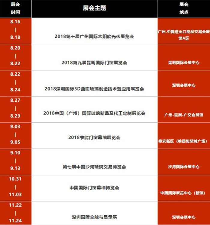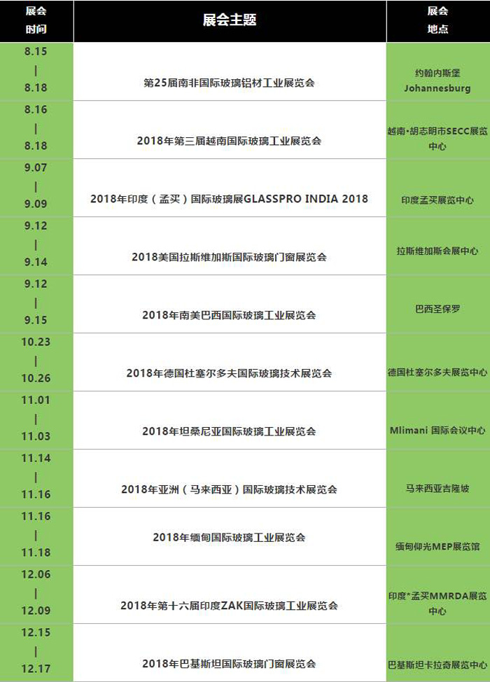 2018年已經過去一半了,大家是否完成了這一年的小目標?為了讓玻璃行業(yè)從業(yè)人員在下半年更好的規(guī)劃自己的時間,參觀到更多展會,了解更多玻璃行業(yè)新產品、新技術和新動態(tài)。中國玻璃網(wǎng)特意為大家整理了【2018下半年國內外玻璃行業(yè)展會一覽】