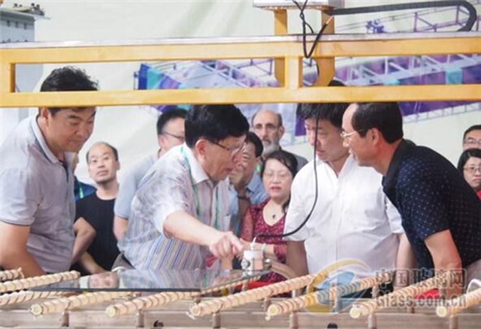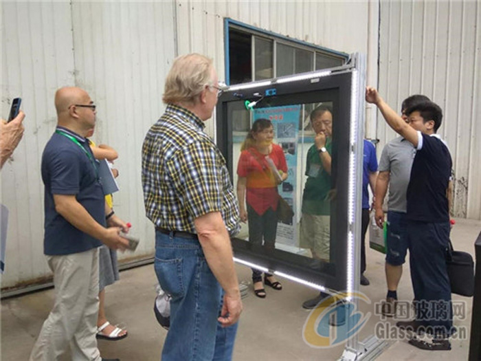 真空玻璃發(fā)明人之一唐健正教授等人一起為新下線的真空玻璃封口
