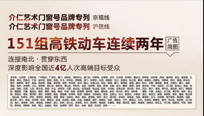 高鐵作為中國人出行首選的交通工具,具有受眾量大、網(wǎng)絡(luò)性強(qiáng)、精準(zhǔn)度高、覆蓋面廣的特點(diǎn),是最具規(guī);途劭托(yīng)的宣傳平臺(tái)。2018年8月10日上午,“介仁藝術(shù)門窗號”京福線和瀘昆線首發(fā)儀式在廈門北站啟動(dòng),它標(biāo)志著廣東介仁玻璃有限公司品牌戰(zhàn)略的再次升級。據(jù)悉,介仁藝術(shù)門窗的高鐵廣告,將登陸全國151組動(dòng)車,涵蓋9萬個(gè)座椅位,連接南北,貫穿東西,深度影響全國近4億人次目標(biāo)受眾,從2018年到2020年,持續(xù)整整兩年。
