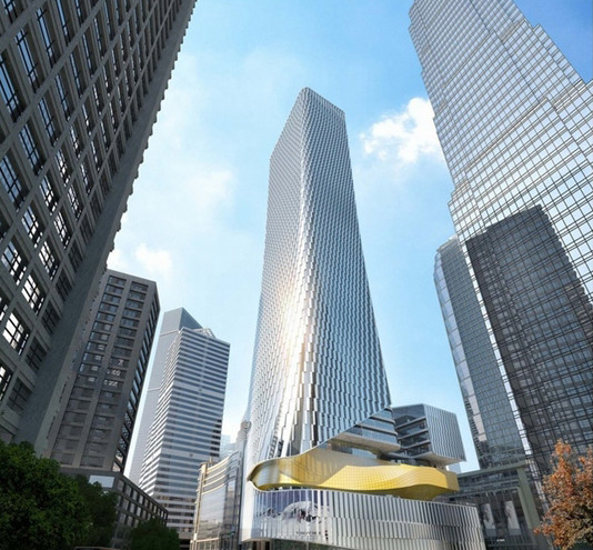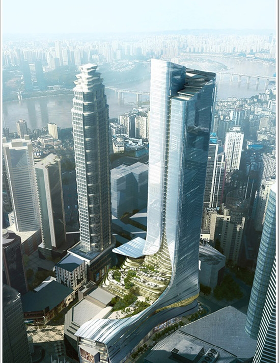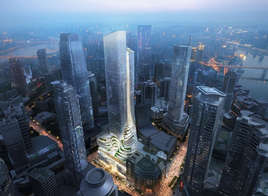 項目整體設計由全球較大的建筑設計事務所之一,Aedas的主席紀達夫和董事溫子先操刀,從中國古諺語“書中自有黃金屋”中汲取設計靈感,并融入重慶當地文化元素,打造出動感十足的商業(yè)綜合體,同時將擁有2萬平米的超級新華書店嵌入裙樓的中心位置,這也將成為重慶較大的書城。而這個超級書城,巧妙地運用了黃金的元素來打造表皮,恰恰應和了設計理念中的“書中自有黃金屋”。