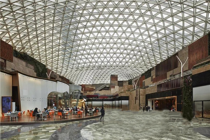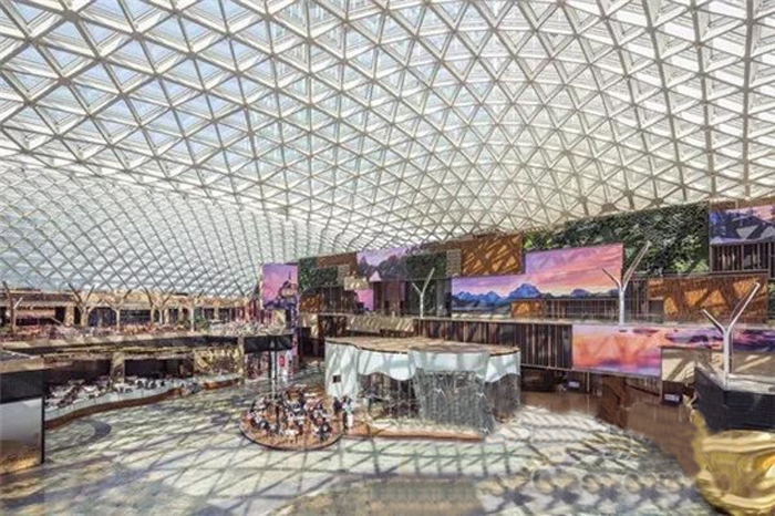 天幕采用精密的斜交網(wǎng)格凈跨鋼結構,縱向跨度長達138.5米,沒有任何支柱支撐;由4365個橫梁和1531個橫梁節(jié)點組成,重約2000噸(約1000輛汽車),在工程界實屬罕見。作為線條流動的多拱形建筑,天幕通過高效的外殼結構體系設計和大跨度單層結構,巧妙地擴寬了視博廣場的空間感,使其在視覺上更顯宏偉,同時亦減少了對外部景觀的阻礙,并確保安裝展覽懸掛點的靈活性。
