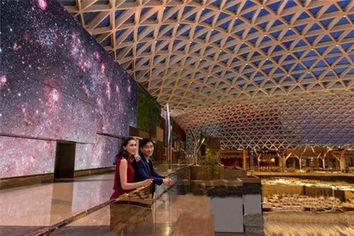 此外,廣場內(nèi)設置了25個面積大小不同的LED屏幕,360度全方位24小時展示一系列來自全球各地的數(shù)碼藝術作品。植物墻環(huán)繞廣場四周,種植了超過10萬棵植物,為賓客締造了悠然舒適的休憩和用餐環(huán)境。廣場以嶄新科技重新定義藝術、娛樂及餐飲體驗,其環(huán)境氣氛會因應天氣、日夜、季節(jié)甚至賓客的一舉一動而轉換,讓賓客仿佛沉浸于活靈活現(xiàn)、精彩紛呈的世界。
