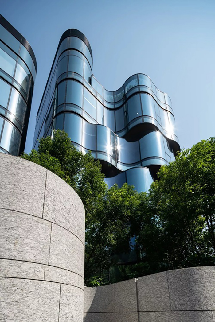 每一幢、每一層都是獨(dú)特的線條,彼此區(qū)別,又相互聯(lián)系。從周邊走過,不同的角度會(huì)看到建筑不同的樣子,像較了瞬息萬變的海。建筑外立面的材料也精心挑選了玻璃幕墻,當(dāng)陽(yáng)光在起伏的曲線玻璃上衍射,便把周邊的風(fēng)景倒映在上面,一步一換,建筑的表面上總是自然風(fēng)景。