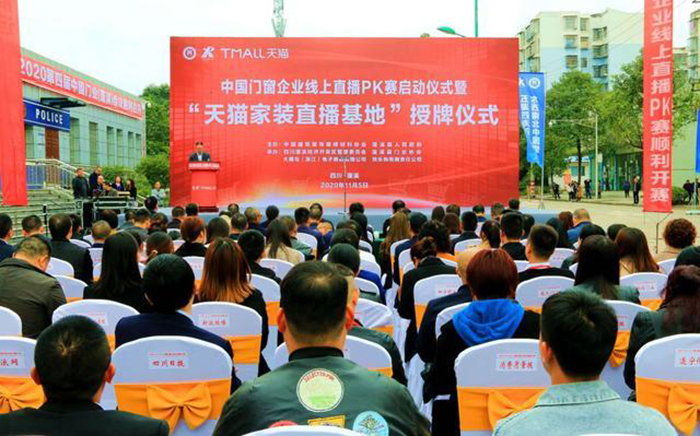 11月5日,由中國建筑裝飾裝修材料協(xié)會、蓬溪縣政府主辦的中國門窗企業(yè)線上直播PK賽啟動儀式暨“中國門都·天貓家裝直播基地”授牌儀式在蓬溪經(jīng)開區(qū)上游片區(qū)舉行,蓬溪縣被授予“中國門都·天貓家裝直播基地”。