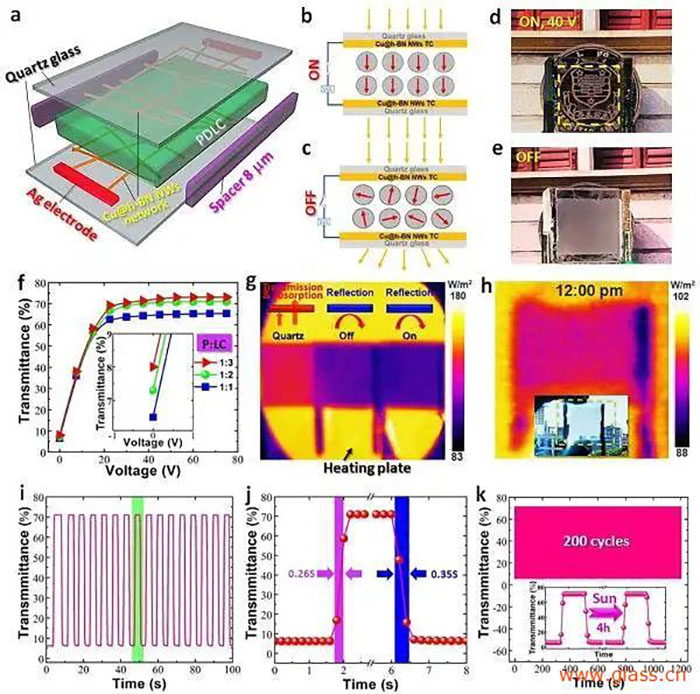 更有趣的,該透明電極具有可見光和紅外光的選擇透過性,基于Cu@h-BN納米線網(wǎng)絡(luò)和液晶技術(shù),作者成功地制備了一種新型智能調(diào)光玻璃,它可以控制玻璃能見度由透明到不透明的快速切換(0.26s);同時,利用Cu@h-BN納米線有效阻擋中紅外光,可屏蔽輻射熱,達到節(jié)能的目的,在軍事等領(lǐng)域還可實現(xiàn)防止紅外監(jiān)控的功能,有望成為未來智能建筑的黑科技組件之一。