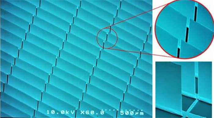 垂直站立的平面微鏡陣列的SEM顯微照片,帶有放大的插圖。圖片來源:Hillmer等。
