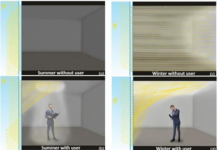 (a)如果在夏天沒有人在場,則所有后視鏡均會垂直切換,從而將太陽光保持在外面。通過大程度地減少熱傳遞,可以節(jié)省大量能源。(b)在夏季,一旦傳感器檢測到用戶存在,則后視鏡將打開并將日光反射到天花板區(qū)域。在沒有用戶站立的地方,房間保持涼爽,節(jié)省了氣候的能源。房間的遠(yuǎn)離窗戶的部分可以通過日光有效地照明,從而節(jié)省了人造光的能量。(c)如果冬天沒有使用者,則所有的鏡子都會打開,并通過將太陽輻射反射到墻壁上作為輻射加熱器來收集能量。這節(jié)省了用于加熱的能量。(d)一旦在冬天檢測到用戶存在,所有的鏡子都會將整個(gè)太陽輻射重定向到天花板,以較大程度地減少眩光,F(xiàn)在,天花板充當(dāng)輻射加熱器,節(jié)省了加熱能量。