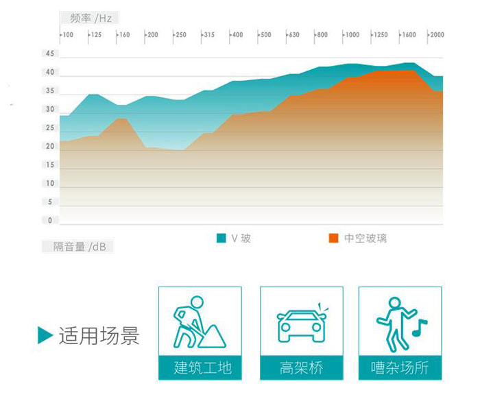 V玻(真空玻璃)計權隔聲量超過39dB,對于交通噪音、施工噪音有很好的降噪效果,適用于高架、建筑工地以及其它噪音嚴重地區(qū)(噪音污染)的民用或商用建筑,而中空玻璃的隔聲量僅29分貝,這十幾分貝的區(qū)別,對我們聽覺系統(tǒng)來說,差異是非常巨大的。