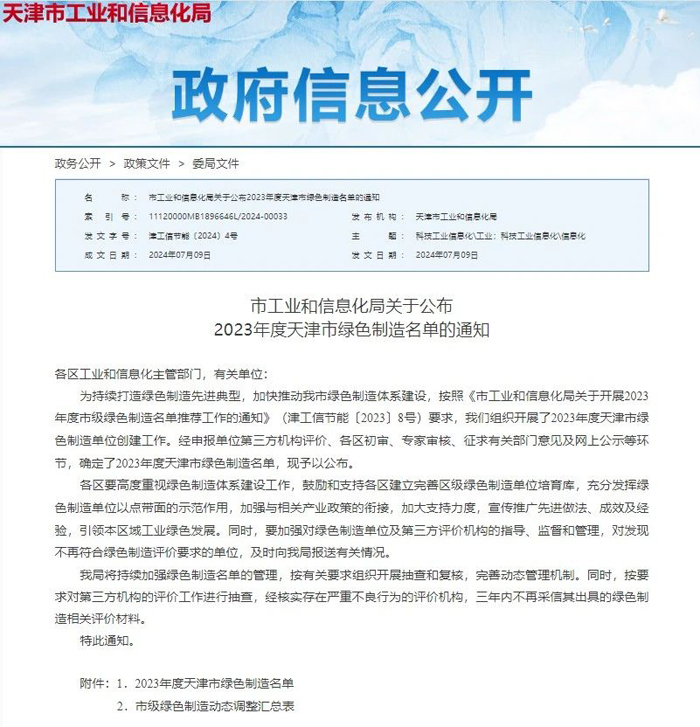 日前,天津市工業(yè)和信息化局公布了2023年度天津市綠色制造名單,望美集團(tuán)旗下分公司天津中玻北方新材料有限責(zé)任公司入選天津市“綠色工廠”。