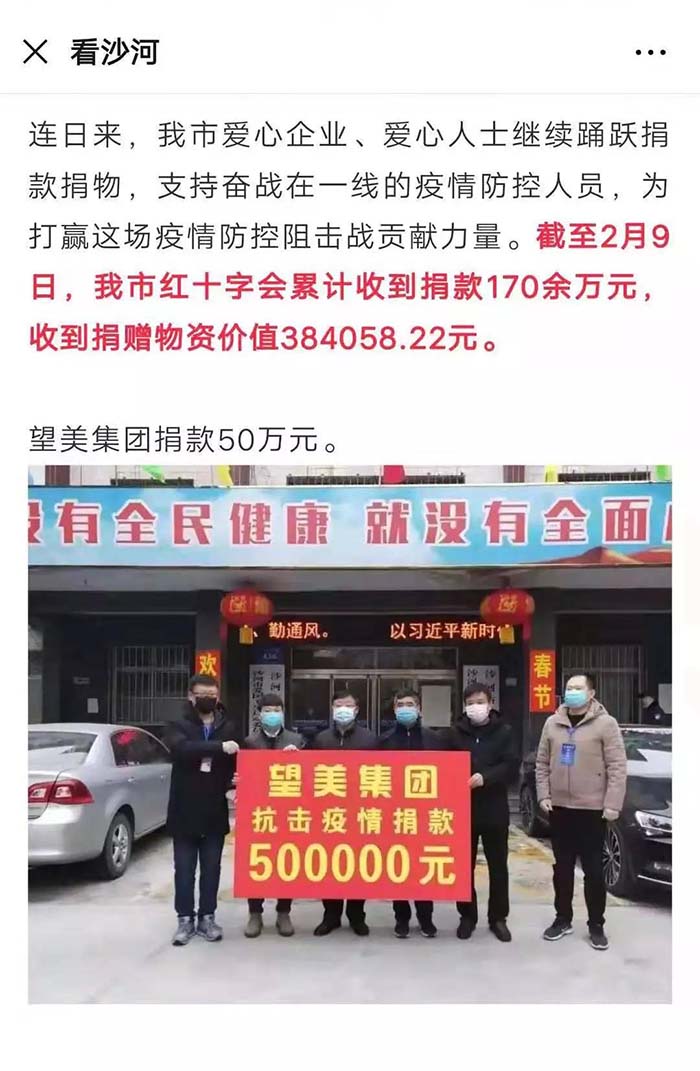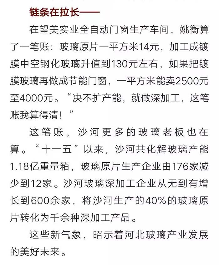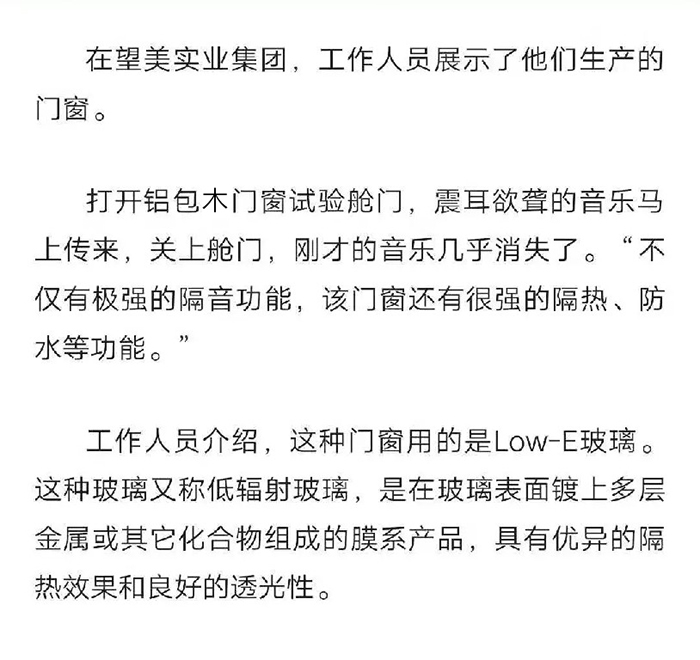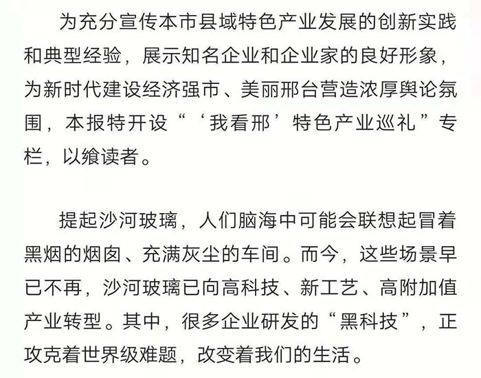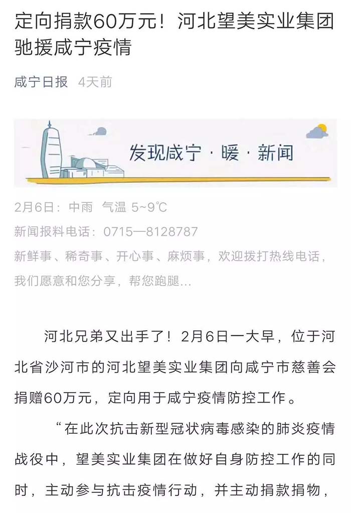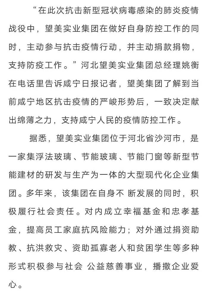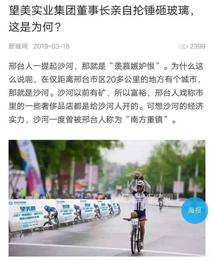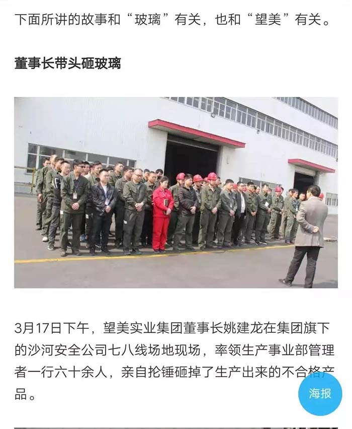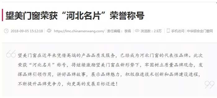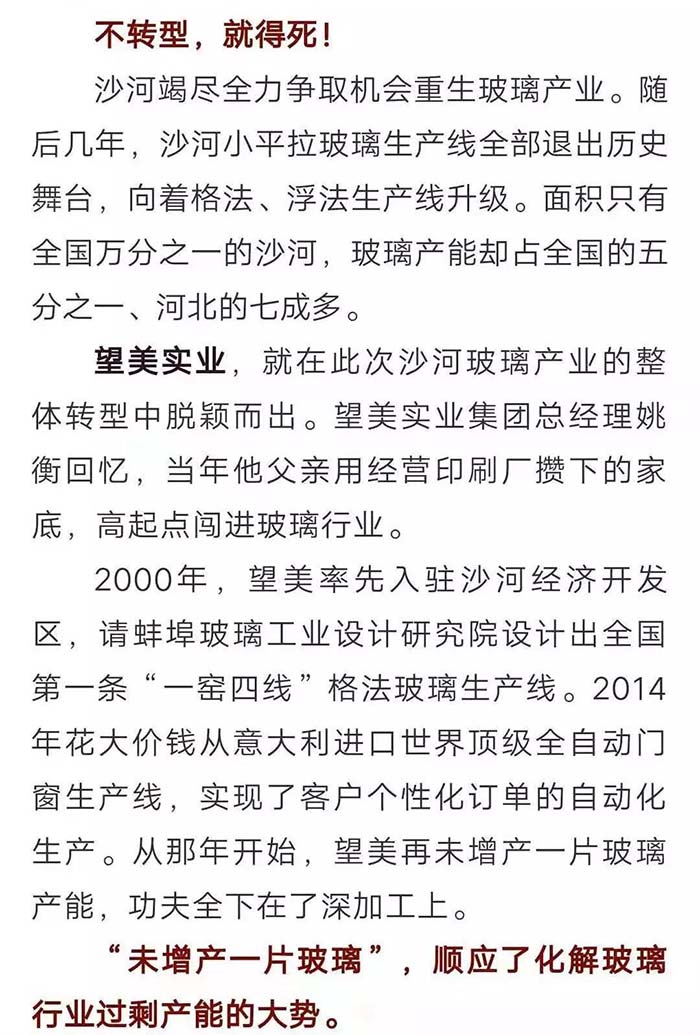 2019年,在河北日報的一期報刊中有這樣一篇報道,名為“一片玻璃的‘蝶變’”,文中提到了望美集團在沙河玻璃產(chǎn)業(yè)轉(zhuǎn)型中的典型事跡。 河北日報 望美的發(fā)展不僅在我們眼中,也在眾人的客觀評價里。那么,媒體眼中的望美你是否見過? 新玻網(wǎng) 這是新玻網(wǎng)對關(guān)于望美集團砸玻璃事件的報道。 望美集團堅持走高質(zhì)量的品牌化發(fā)展戰(zhàn)略,狠抓質(zhì)量管理,致力為客戶提供高品質(zhì)的產(chǎn)品和高品位的服務(wù)。“以客戶為中心,以奮斗者為本,以共贏促發(fā)展”,望美集團是認(rèn)真的! 中華門窗網(wǎng) 2018年9月4日,由河北省發(fā)改委、省質(zhì)監(jiān)局、省工信廳、省住建廳、省農(nóng)業(yè)廳、省旅發(fā)委、省國資委、河北日報報業(yè)集團、省品牌戰(zhàn)略促進會共同主辦第十二屆河北品牌節(jié)在石家莊舉行。 望美實業(yè)集團有限公司的“望美門窗”榮獲2018年度“河北名片“榮譽稱號。 牛城晚報 2019年4月18日,“我看邢”特色產(chǎn)業(yè)巡禮主題宣傳活動在沙河啟動。 來自新華社、中央廣播電視總臺、農(nóng)民日報、河北日報、河北廣播電視臺等中央、省、市媒體記者及自媒體人于當(dāng)日先后到望美集團旗下的望美實業(yè)、沙河安全公司進行實地采訪。 媒體公眾平臺 咸寧日報、薊州開發(fā)區(qū)黨群服務(wù)中心、看沙河對望美捐款事跡的報道。 為支持新型冠狀病毒感染肺炎疫情防控工作,望美集團旗下沙河安全、望美實業(yè)、天津中玻、中玻朝陽四家分公司積極伸出援手,向防御疫情需要的地區(qū)提供了資金或者物資的援助,總金額近150萬元。 望美致力于打造緊跟社會發(fā)展步伐的、與時俱進的時代公司,經(jīng)營精細(xì)化、運營智能化的現(xiàn)代化智慧公司,人人有愛心,講文明、懂感恩、知敬畏、明事理、充滿正能量的大愛公司。 在未來的發(fā)展之路上,望美集團將以更加嶄新的姿態(tài),更加奮發(fā)昂揚的干勁和精神,馳而不息地朝著時代公司、智慧公司、大愛公司堅實邁進,譜寫新時代企業(yè)發(fā)展的新篇章!