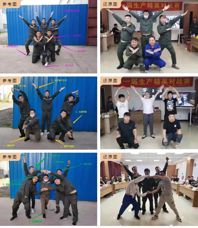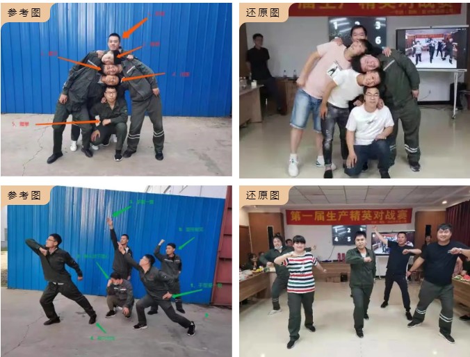 第一環(huán)節(jié):眾志成城。以抽簽的形式?jīng)Q定出場順序,隊員先行離場,隊長在一分鐘內(nèi)記住所抽取的照片的動作,然后隊員入場指揮其進(jìn)行還原。每個小組的隊長可謂是用盡渾身解數(shù),對每個人的動作分解、記憶、還原......
