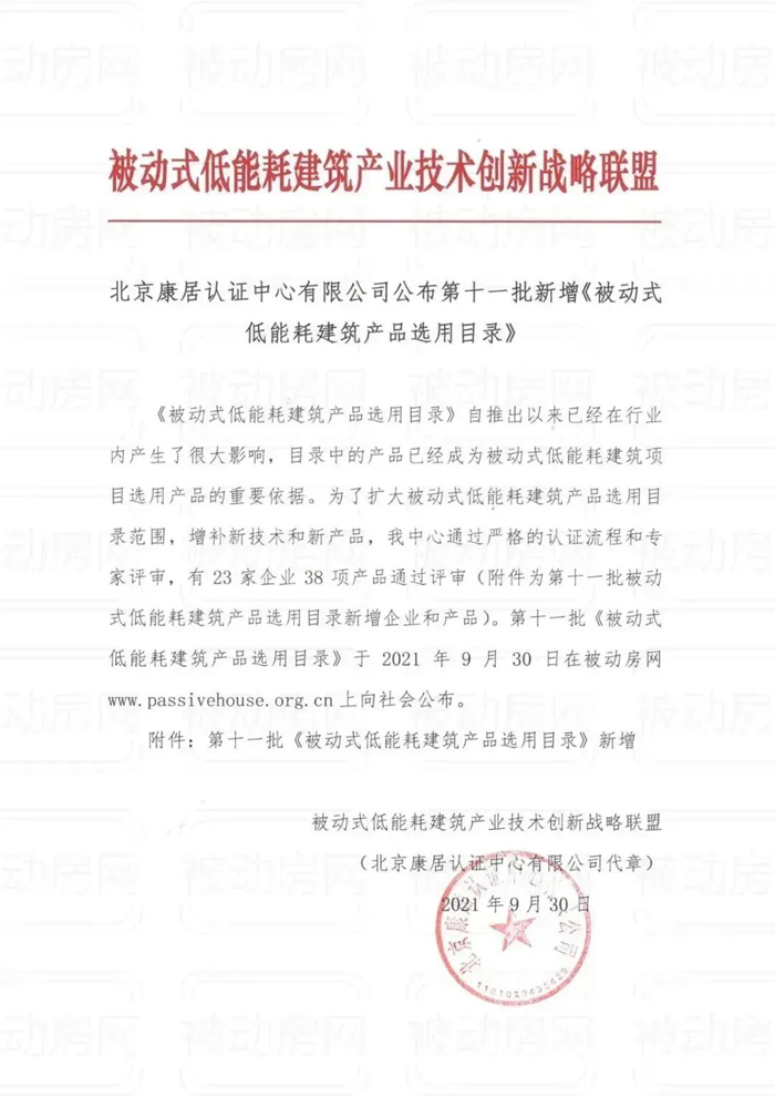 北京康居認(rèn)證中心有限公司公布第十一批新增《被動(dòng)式低能耗建筑產(chǎn)品選用目錄》(以下簡(jiǎn)稱《目錄》)。