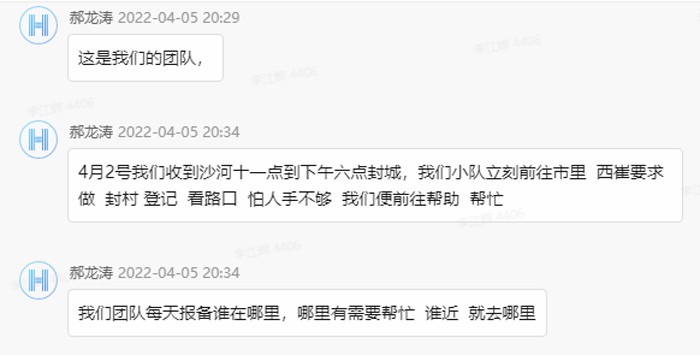 生產(chǎn)七線郝龍濤和他的伙伴們,自發(fā)成立義務(wù)救援隊,無條件去幫忙需要的人。如之前參加學(xué)校開學(xué)前的消毒等。