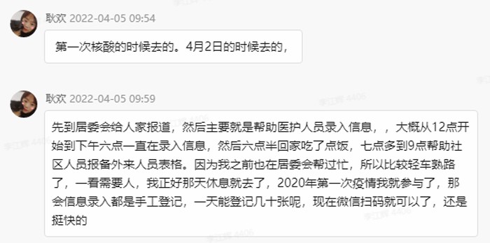 倉儲管理部的耿歡因為有之前在居委會幫忙的經(jīng)歷,于是在時間和條件允許的情況下,也參與到了此次疫情應(yīng)對戰(zhàn)中。